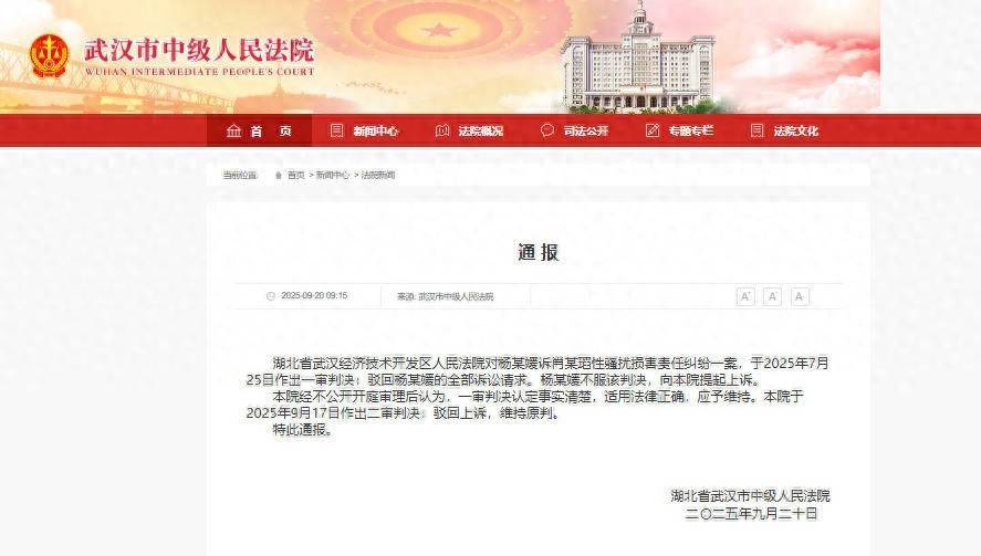 9月20日,湖北省武汉市中级人民法院官网发布情况通报:湖北省武汉经济技术开发区人民法院对杨某媛诉肖某瑫性骚扰损害责任纠纷一案,于2025年7月25日作出一审判决:驳回杨某媛的全部诉讼请求。杨某媛不服该判决,向本院提起上诉。本院经不公开开庭审理后认为,一审判决认定事实清楚,适用法律正确,应予维持。本院于2025年9月17日作出二审判决:驳回上诉,维持原判。