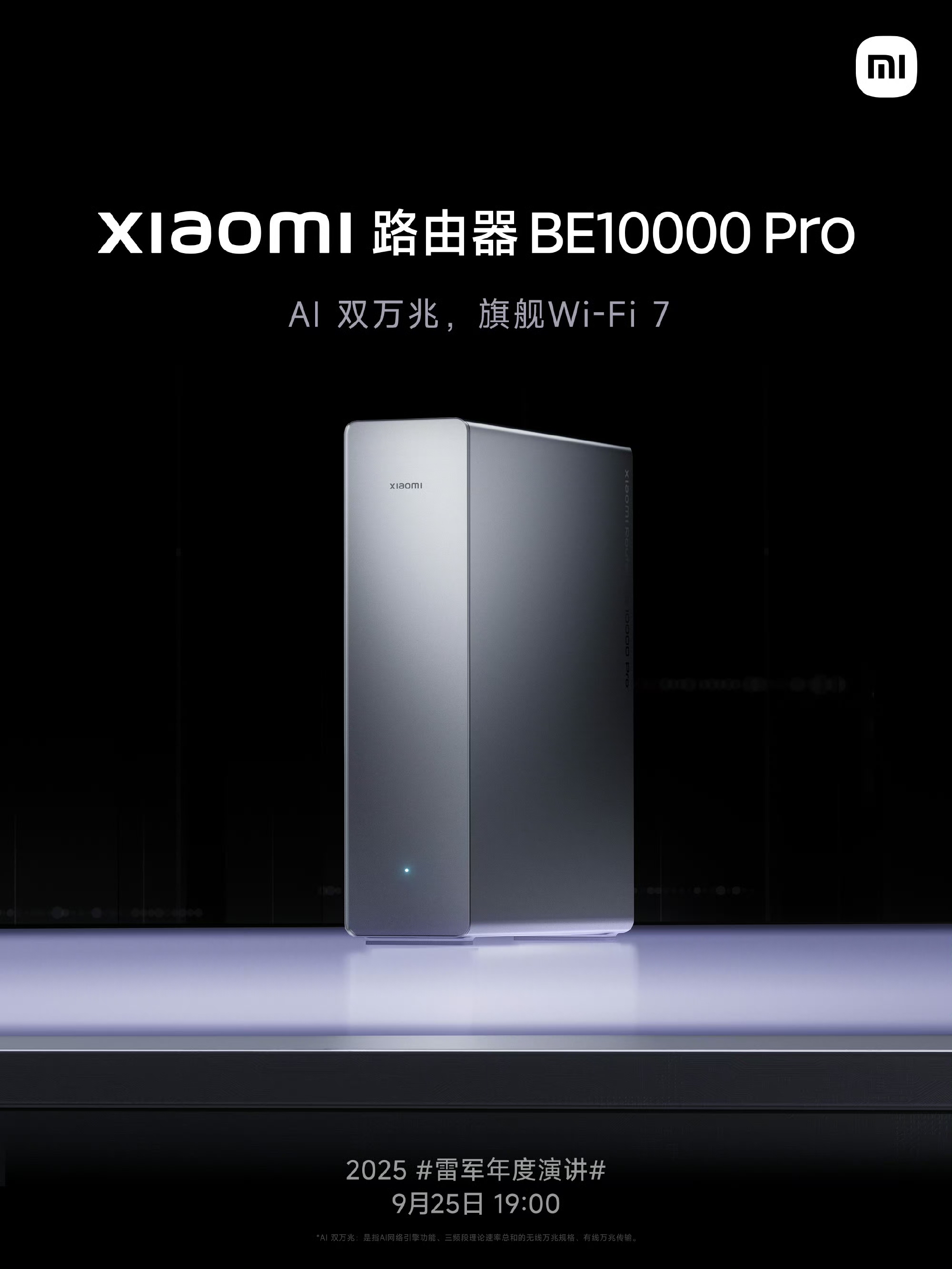 IT之家 9 月 25 日消息,据小米智能生态官微,在今晚的 2025 雷军年度演讲活动中,小米路由器新品 BE10000 Pro 将正式发布。这是一款定位高端的产品,支持“AI 双万兆”及 Wi-Fi 7。
